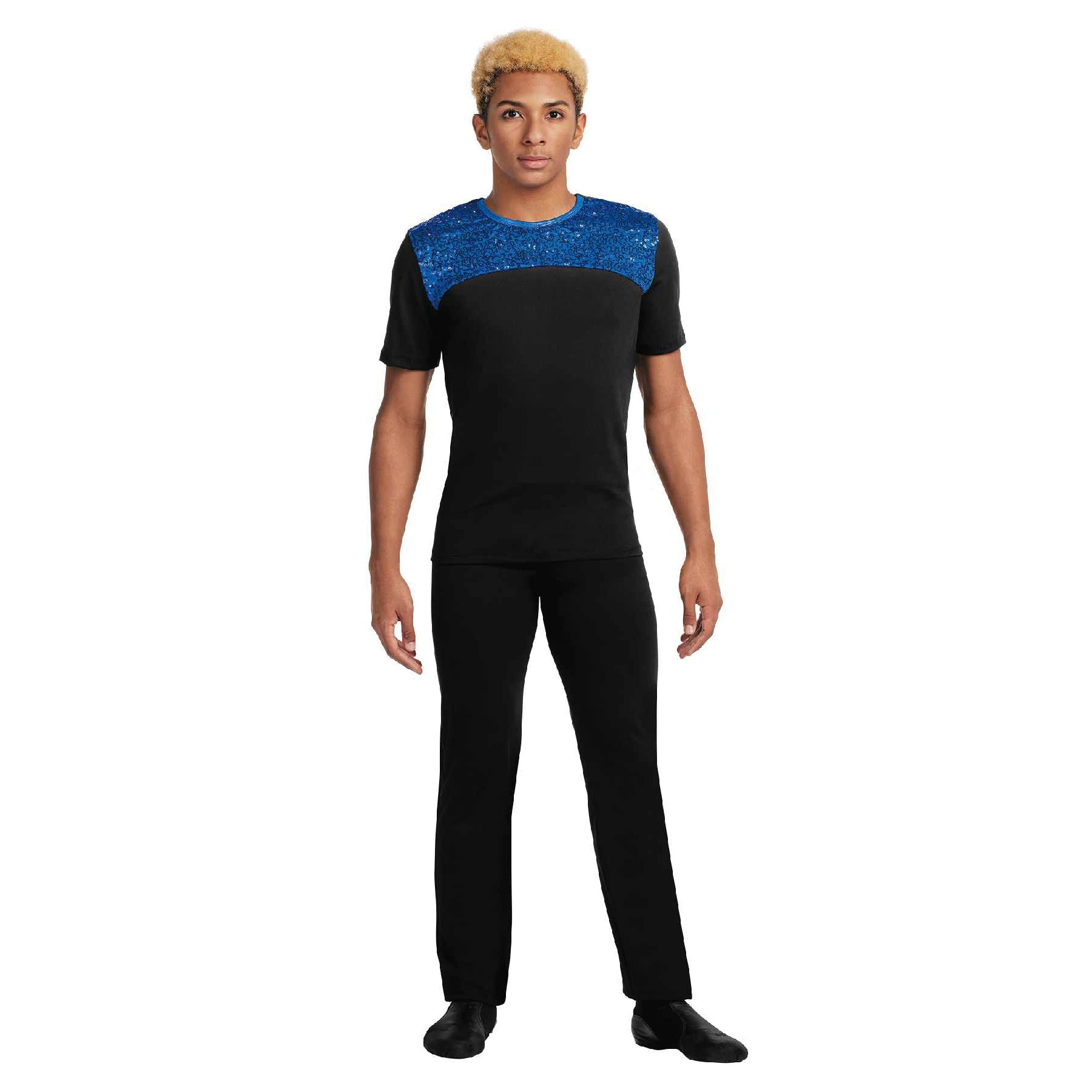 Black short sleeve male top with micro sequin accent. Your Choice of Kelly, Orange, Red, Royal or Silver. Pants sold separately. Matching female companion available.