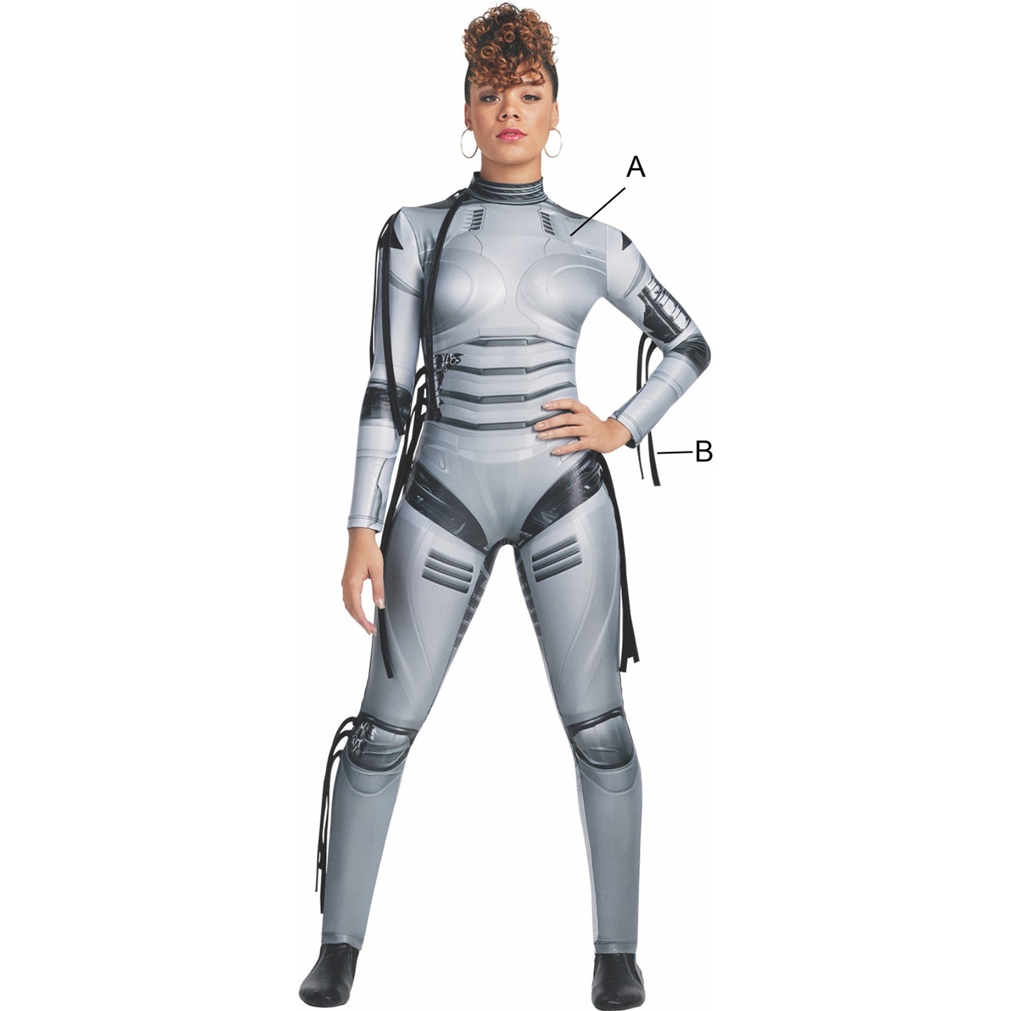 Android inspired long sleeve jumpsuit with mystique binding. Zipper back.