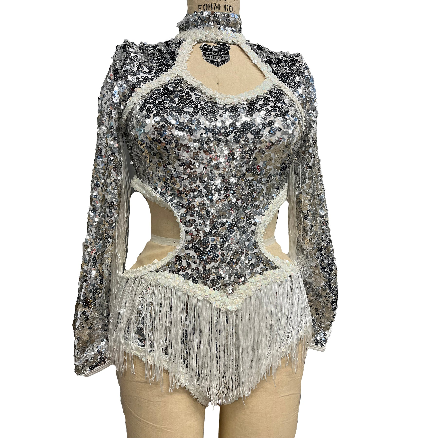 Long-sleeve leotard features a sweetheart neckline and open side cut outs. Constructed from sparkling ultra sequins, sequin trim and fringe this design radiates power.