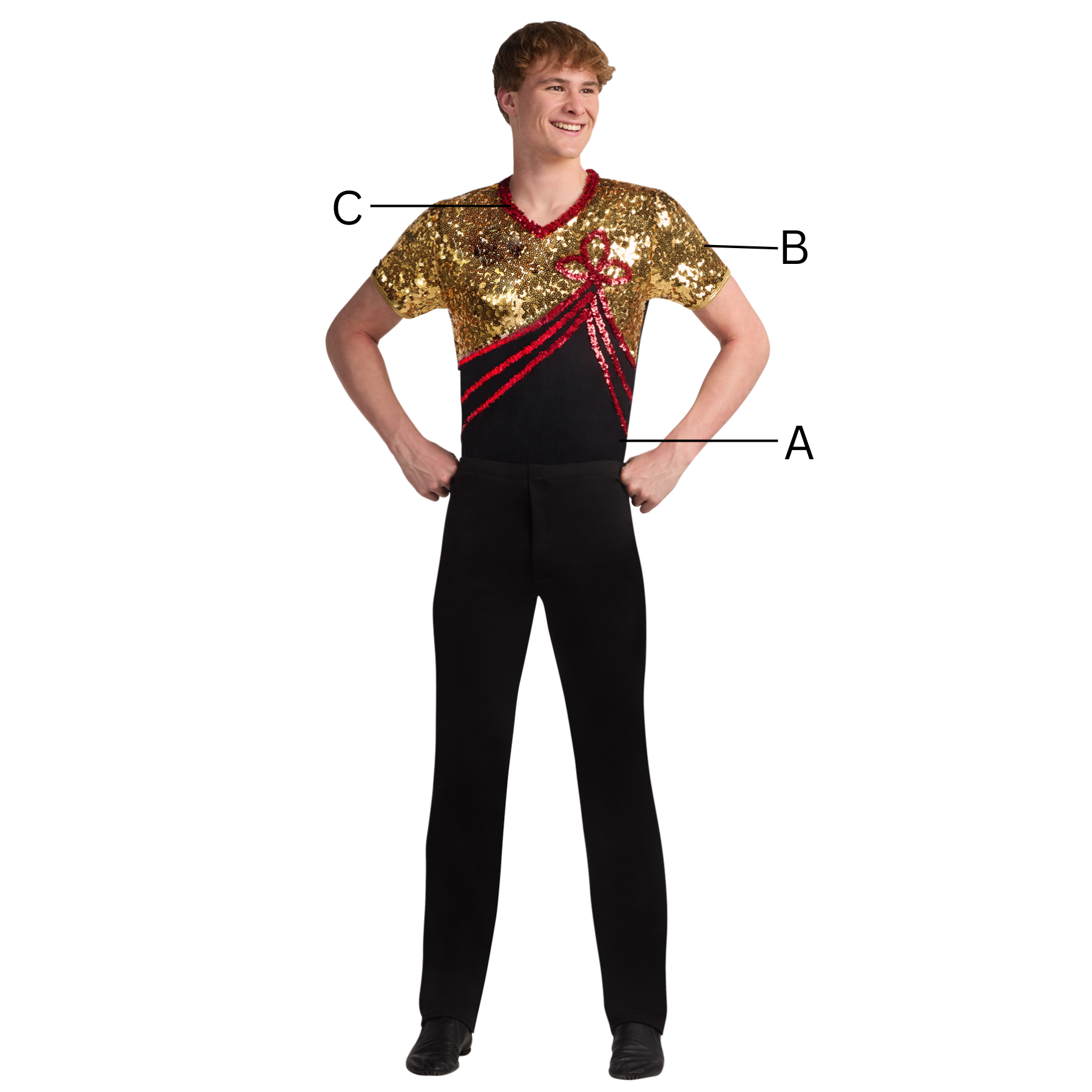 Spandex top with ultra sequin chest and sleeves. Accented with sequin trim. Pants sold separately. Also available as a boy-tard with snap crotch (add $10)