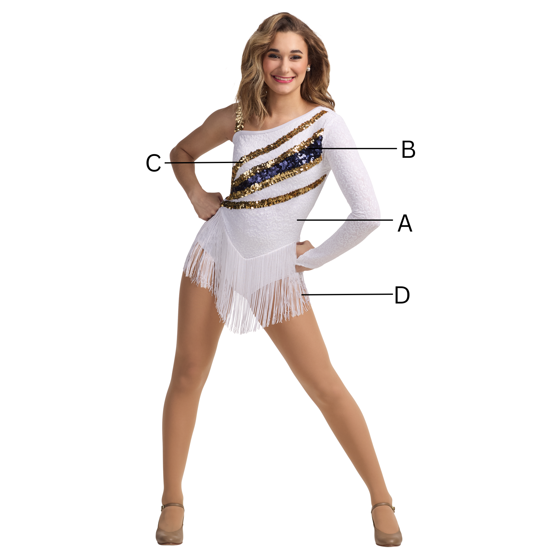 One sleeve micro sequin leotard with ultra sequin insets. Accented with sequin trim and fringe. Matching male companion available.