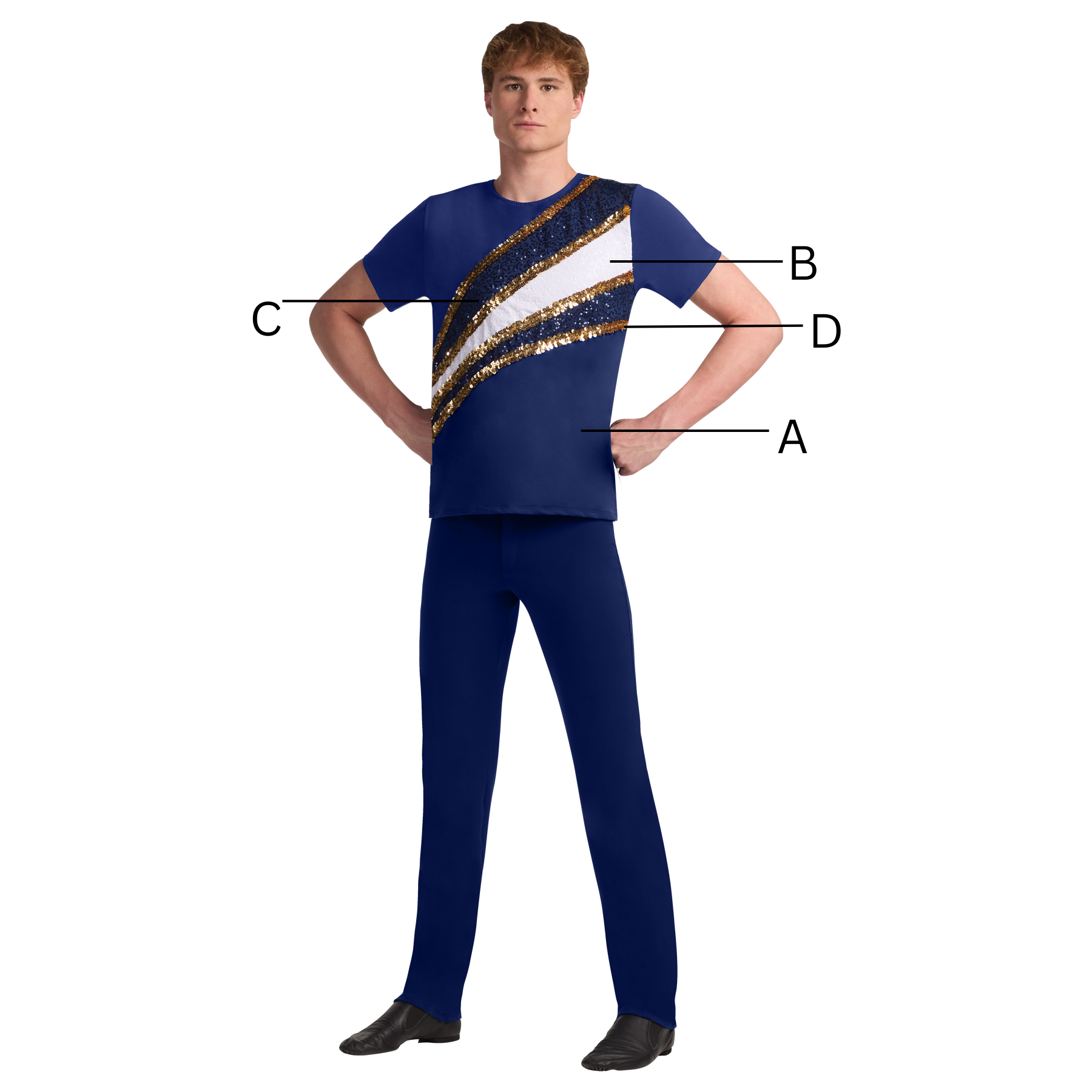 Short sleeve spandex top with micro sequin and ultra sequin bodice insets. Accented with sequin trim. Also available as a boy-tard with snap crotch (add $10). Pants sold separately. Matching female companion available.
