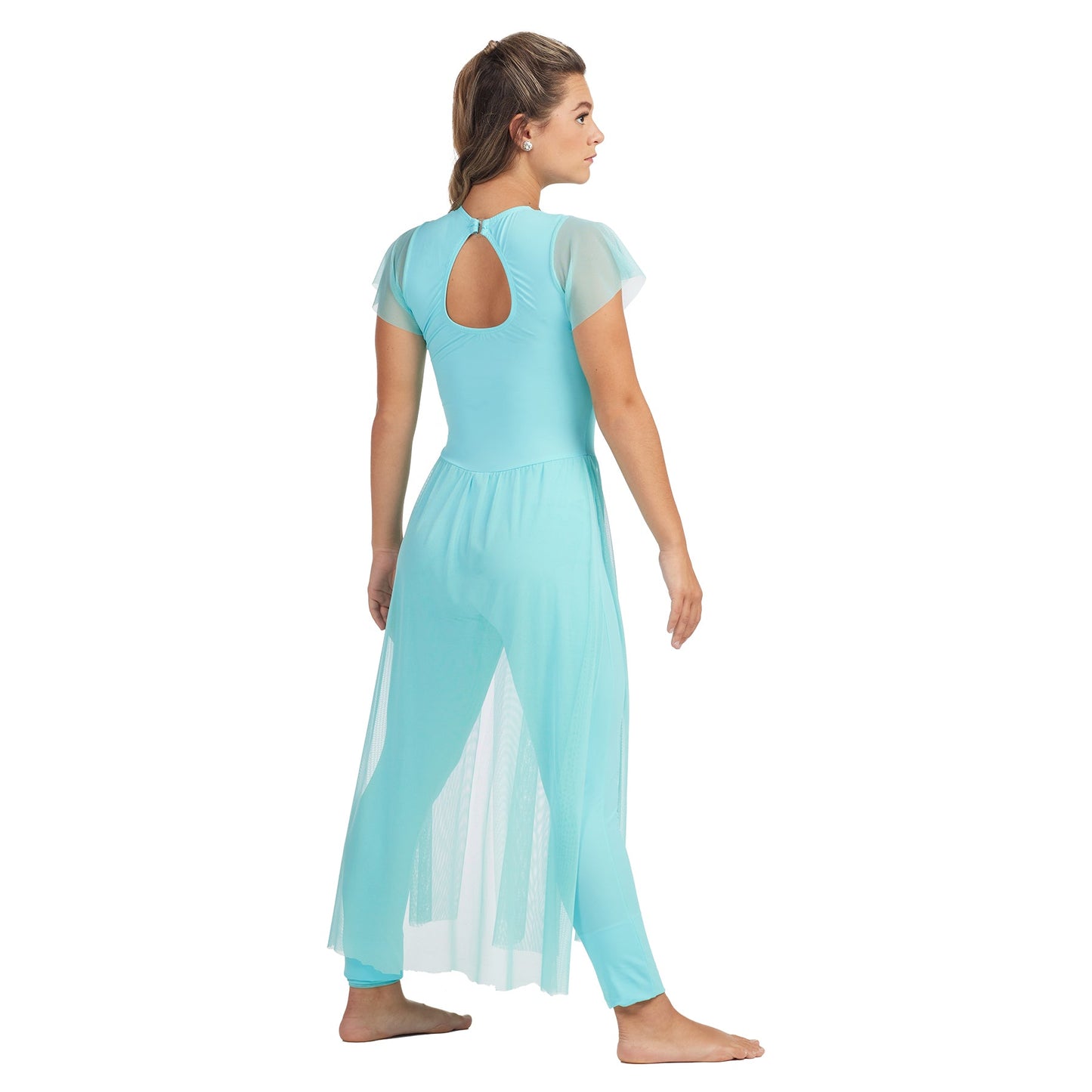 Flutter sleeve legging jumpsuit with attached mesh skirt.