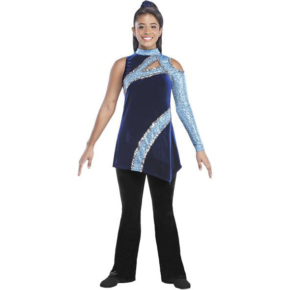 Plush velvet and micro sequin one sleeve tunic top with cut outs. Accented with sequin trim. Pants sold separately.