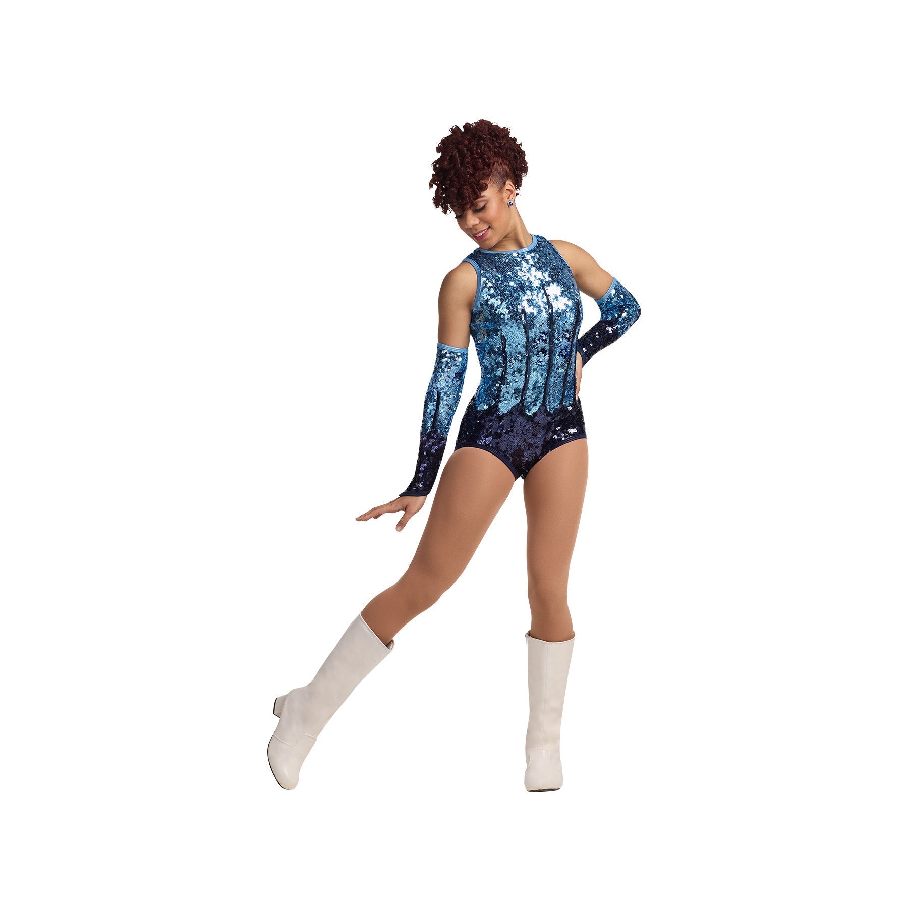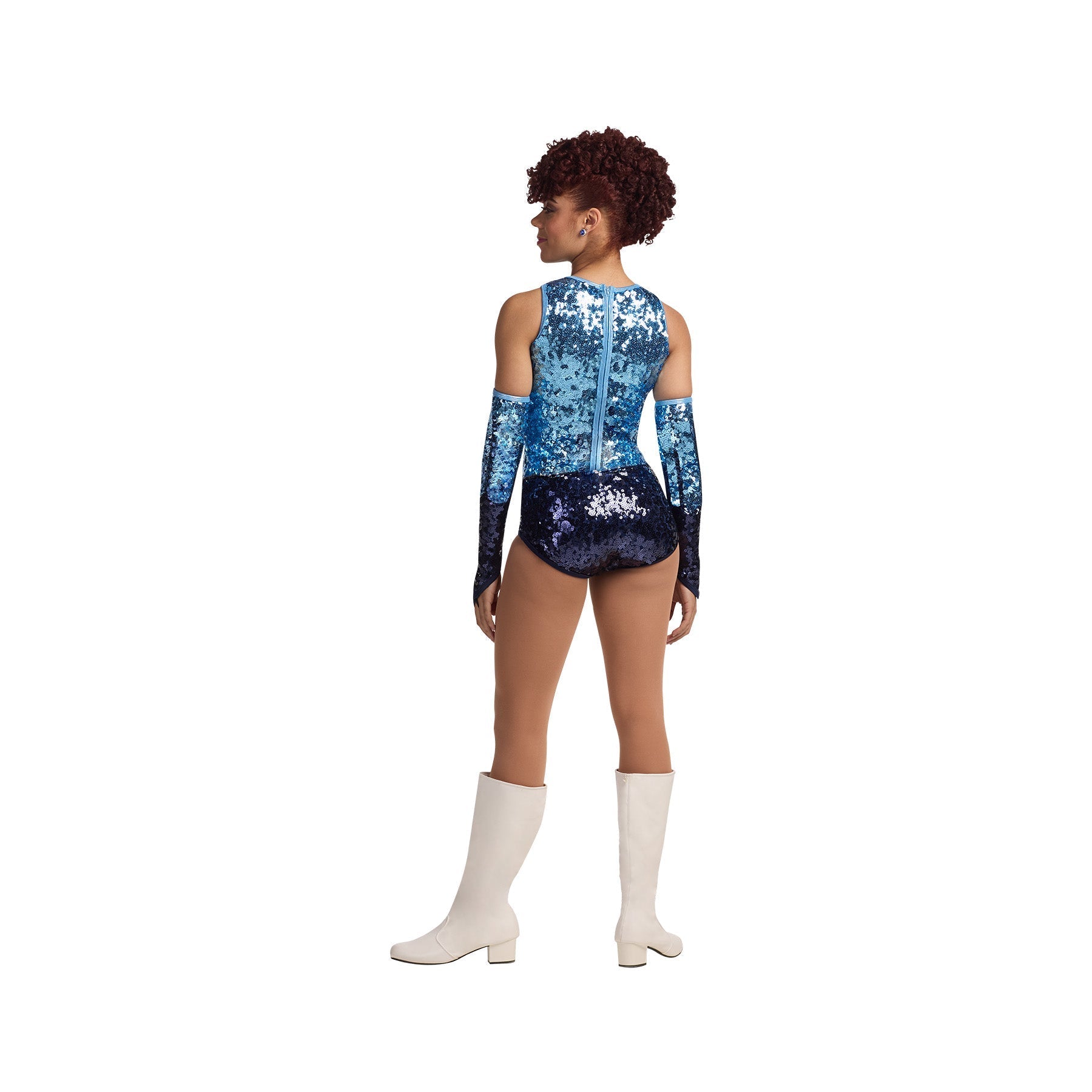 Two-Tone Ultra sequin leotard with sequin trim. Zipper back. Gloves sold separately. Matching male companion available.