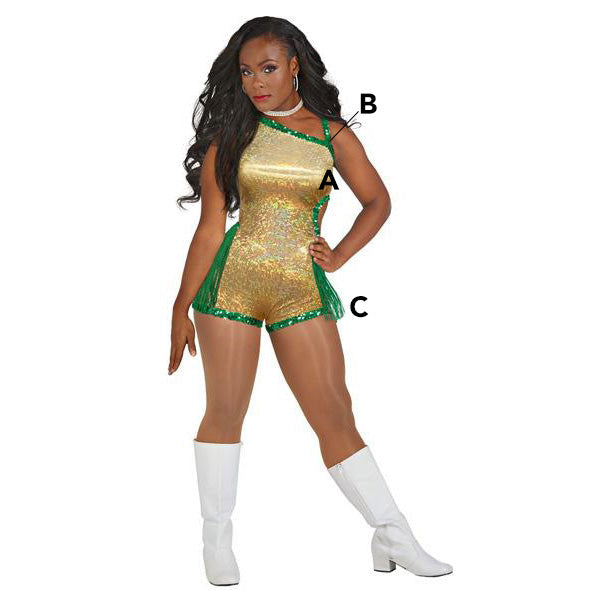 One shoulder metallic prism boy cut leotard has side cut out. Accented with sequin trim. Attached back fringe.