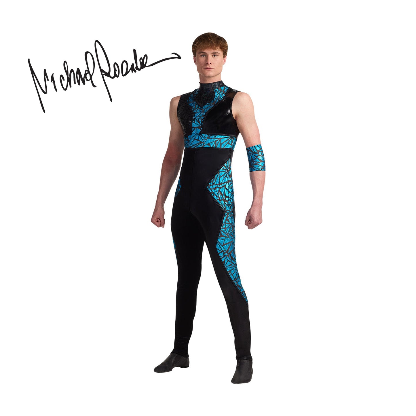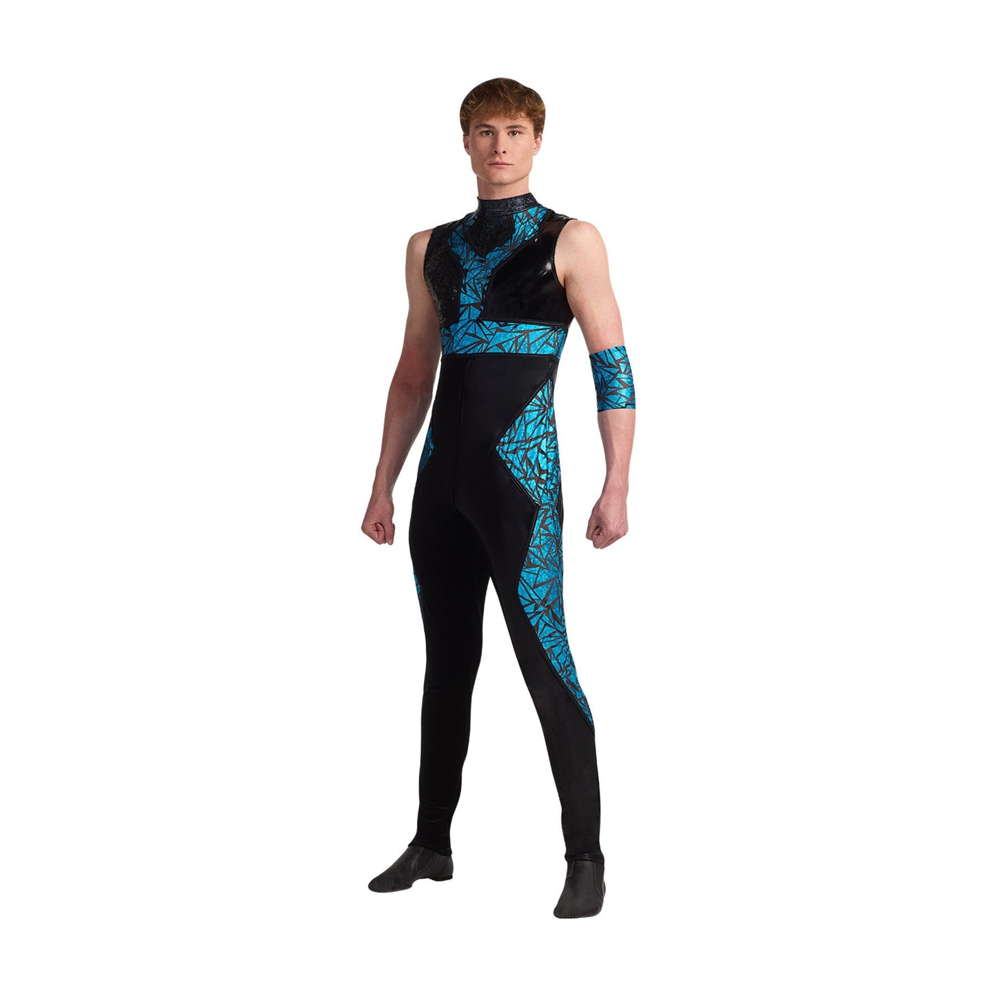 Sleeveless jumpsuit features twinkle sequin, vinyl and plush with foil inserts and mystique binding. Zipper back. Armband included. Matching female companion available