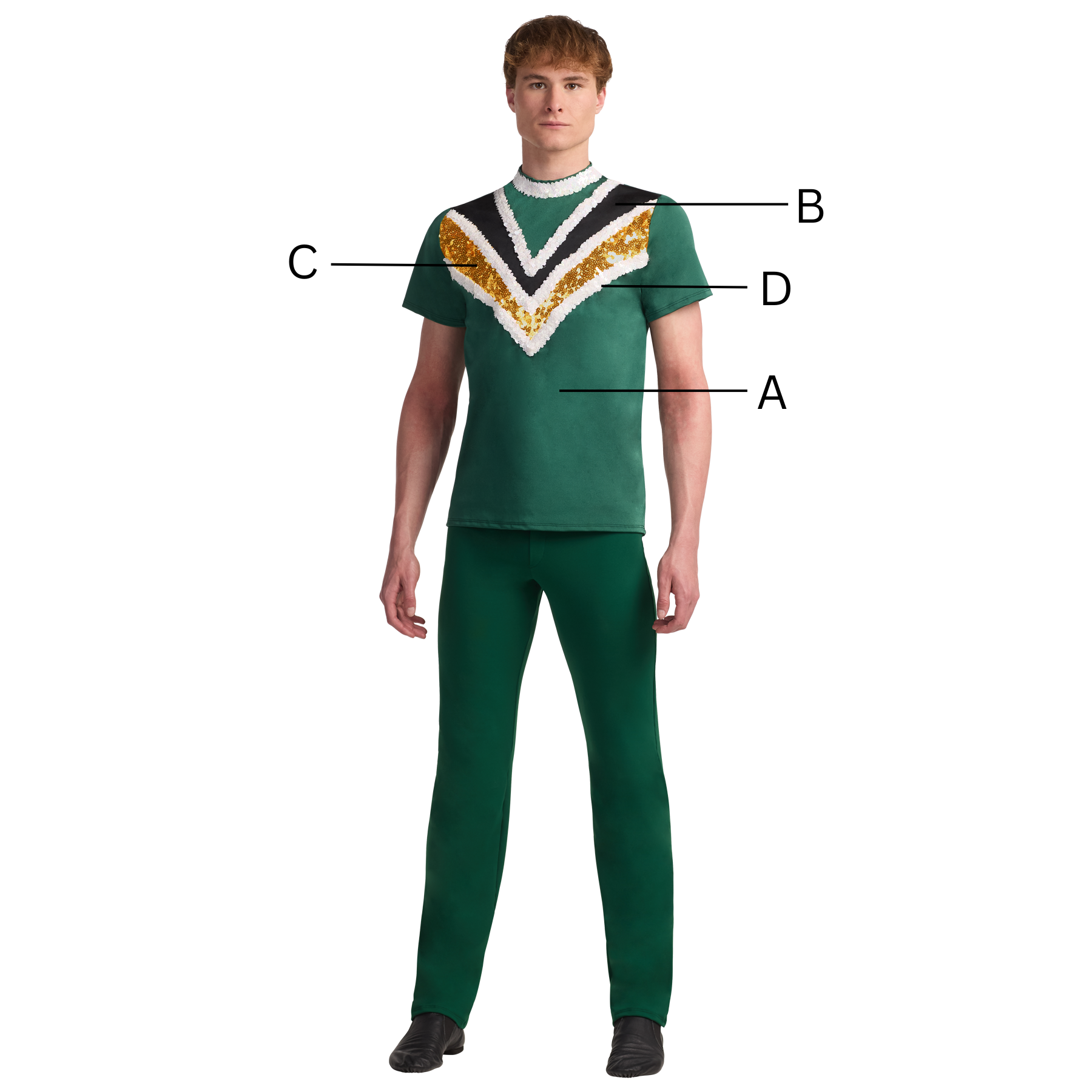Short sleeve spandex male top with spandex and ultra sequin insets. Accented with sequin trim. Also available as a boy-tard with snap crotch (add $10). Matching female companion available