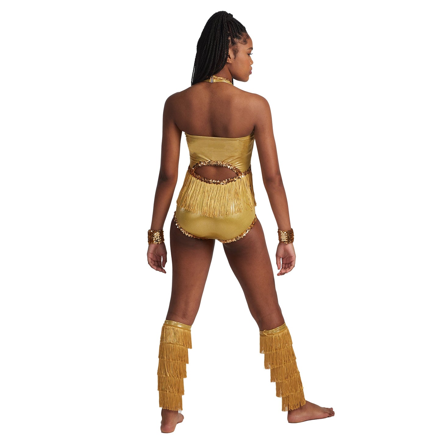 Mystique and ultra sequin halter leotard with sequin trim accents and fringe. Accessories sold separately.