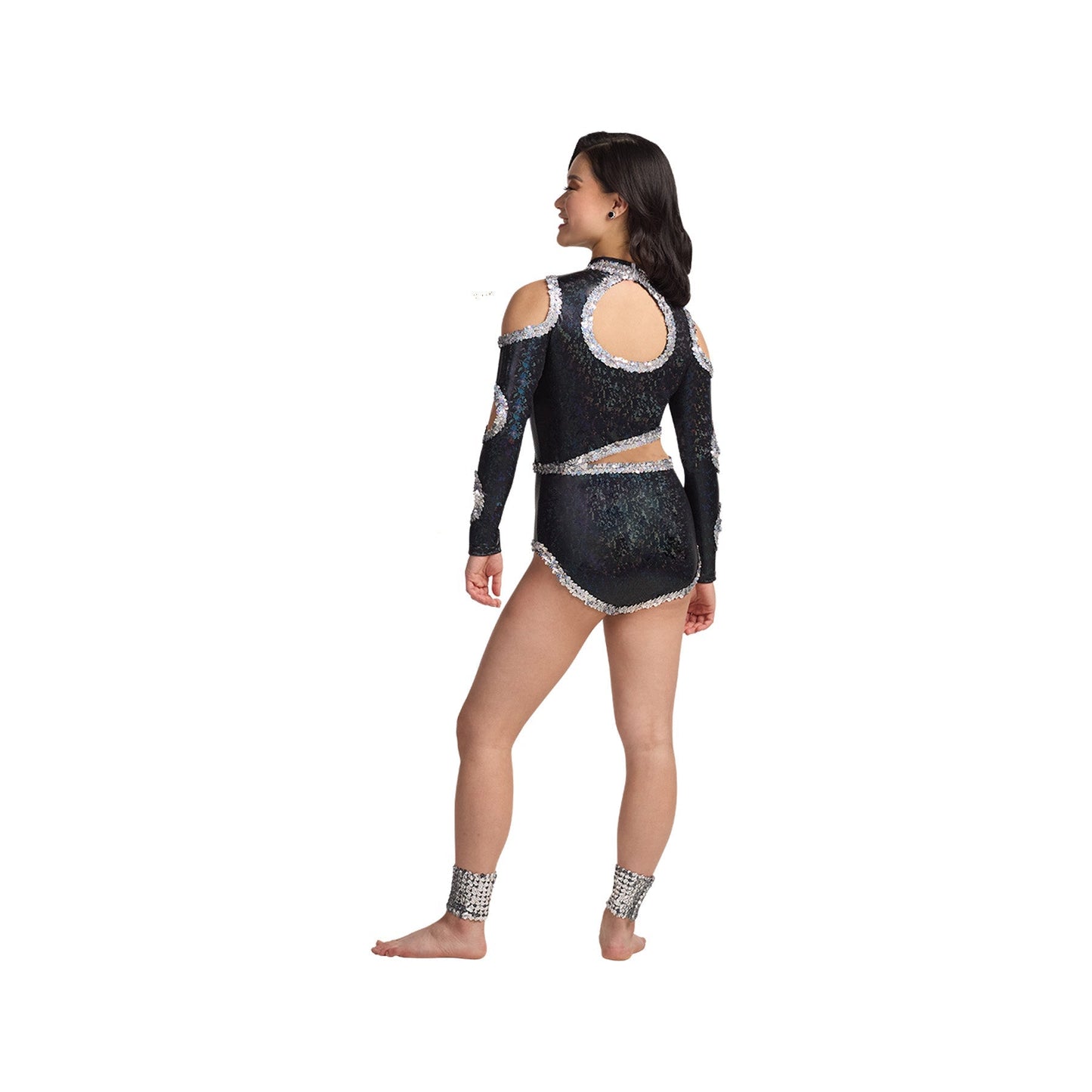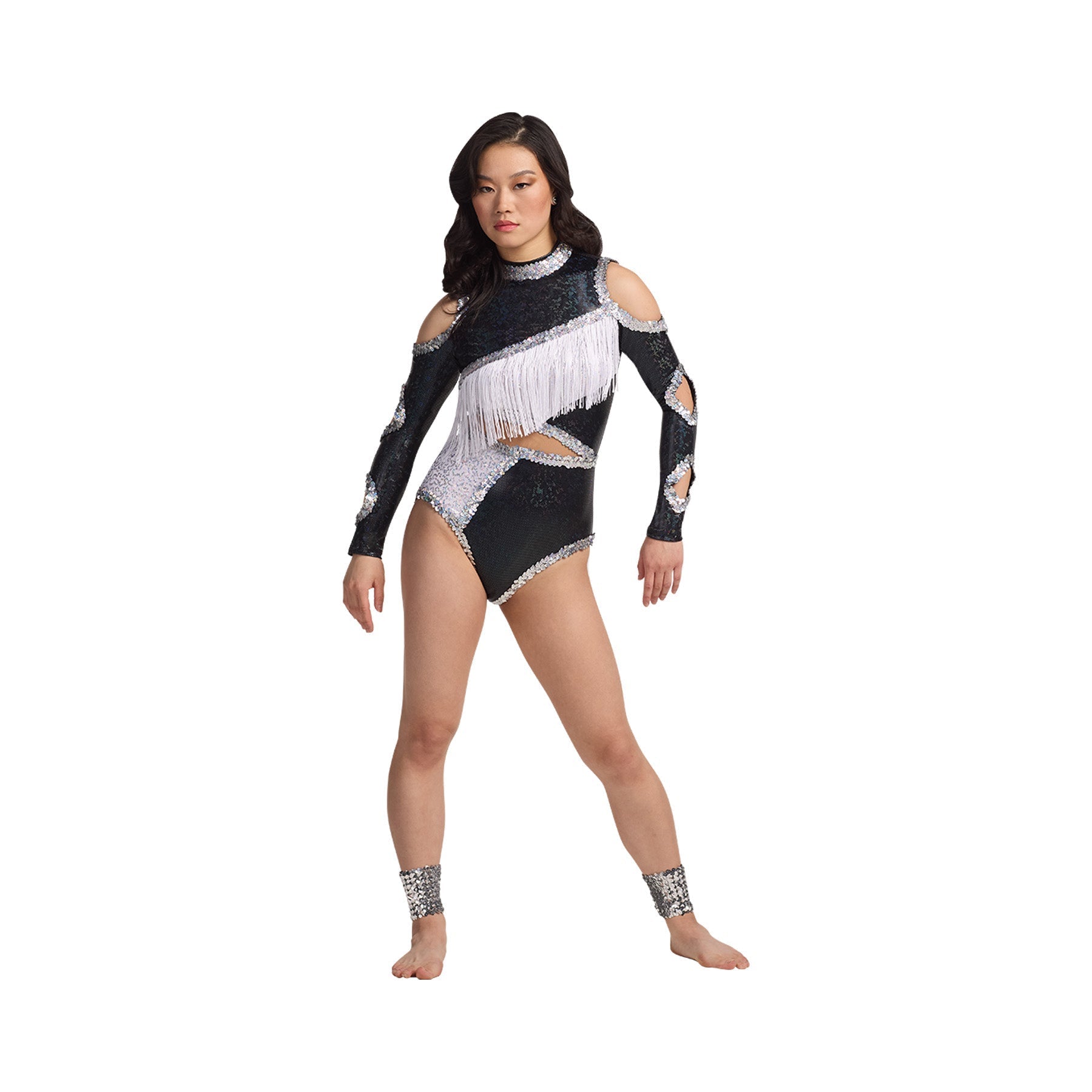 Cut out long sleeve metallic prism leotard with micro sequin insets and mesh middle. Accented with sequin trim and fringe. Keyhole back.