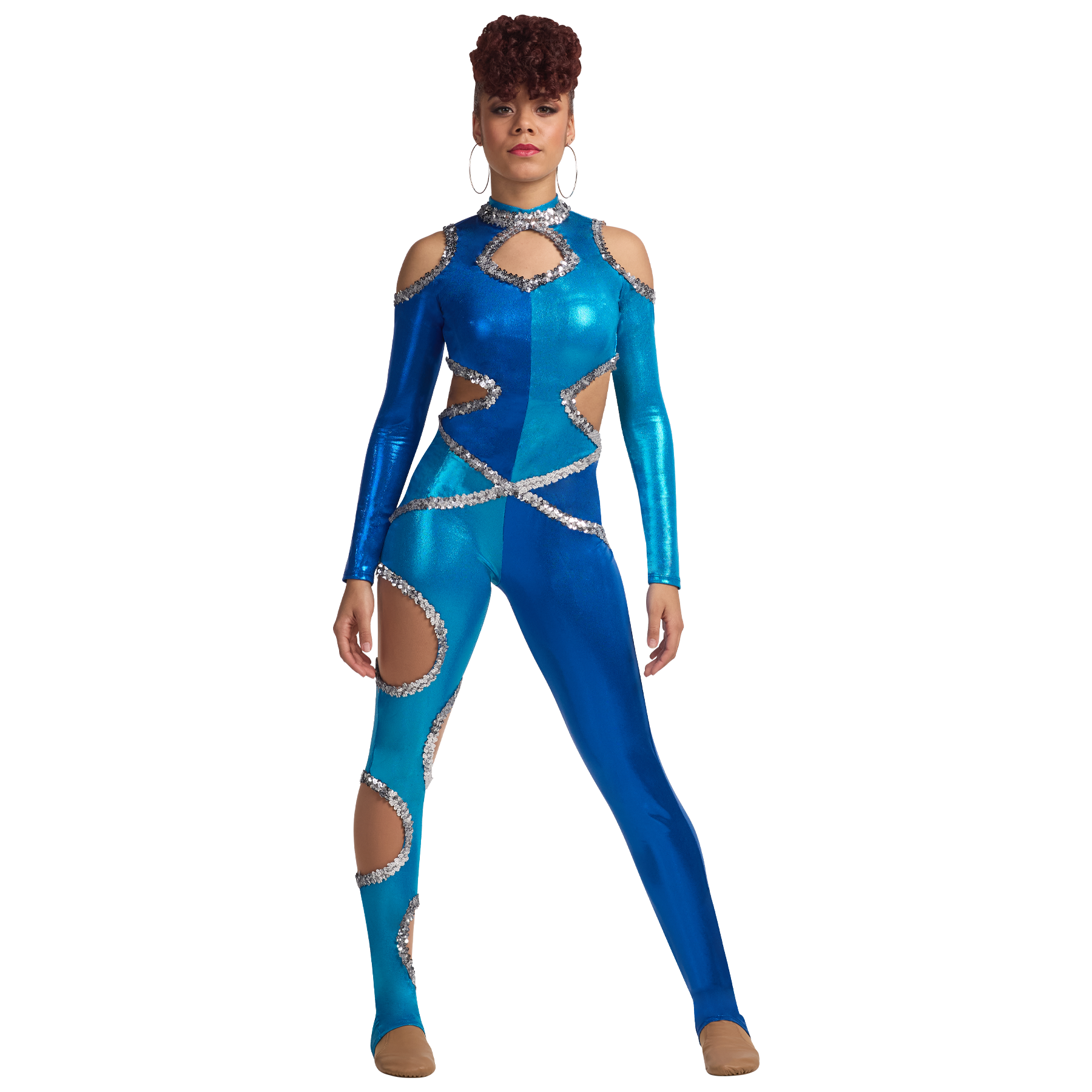 Two tone mystique jumpsuit with cut outs. Accented with sequin trim. Keyhole back.