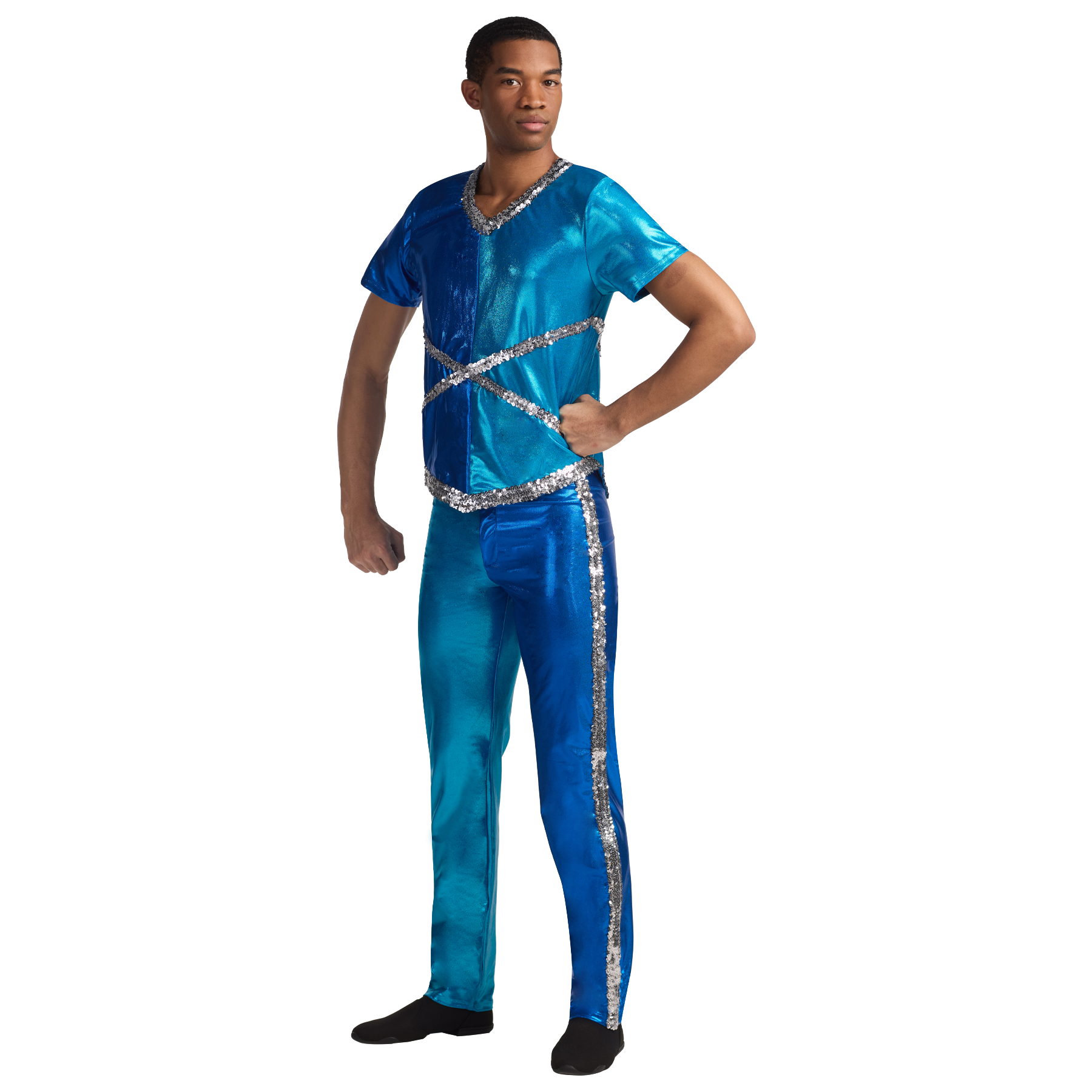Two tone mystique male top and pants. Accented with sequin trim.