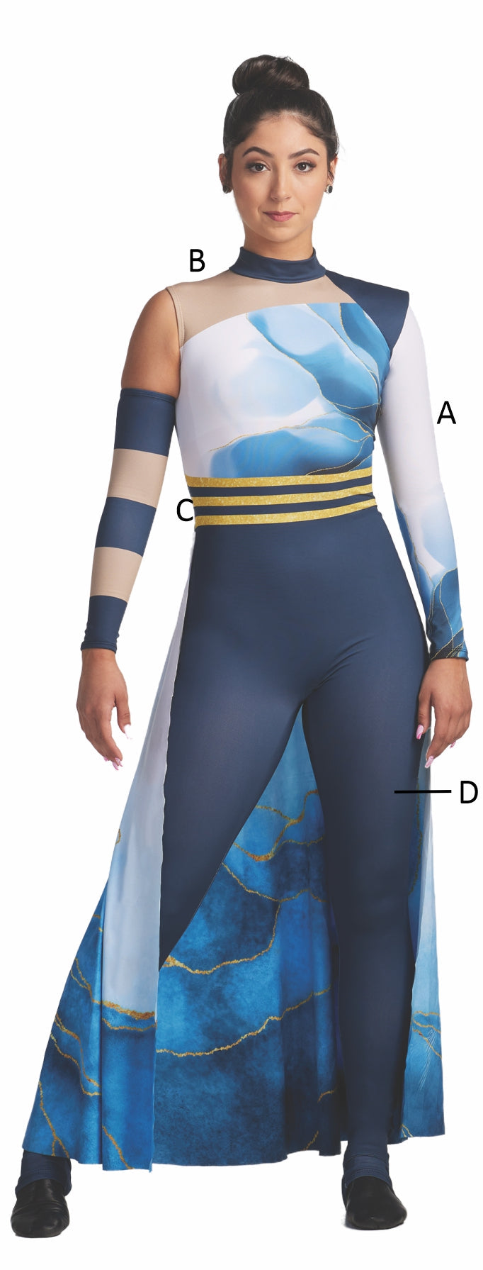 Long sleeve sublimated jumpsuit features flesh colored open back illusion. Attached 2 sided print skirt. Glove included.